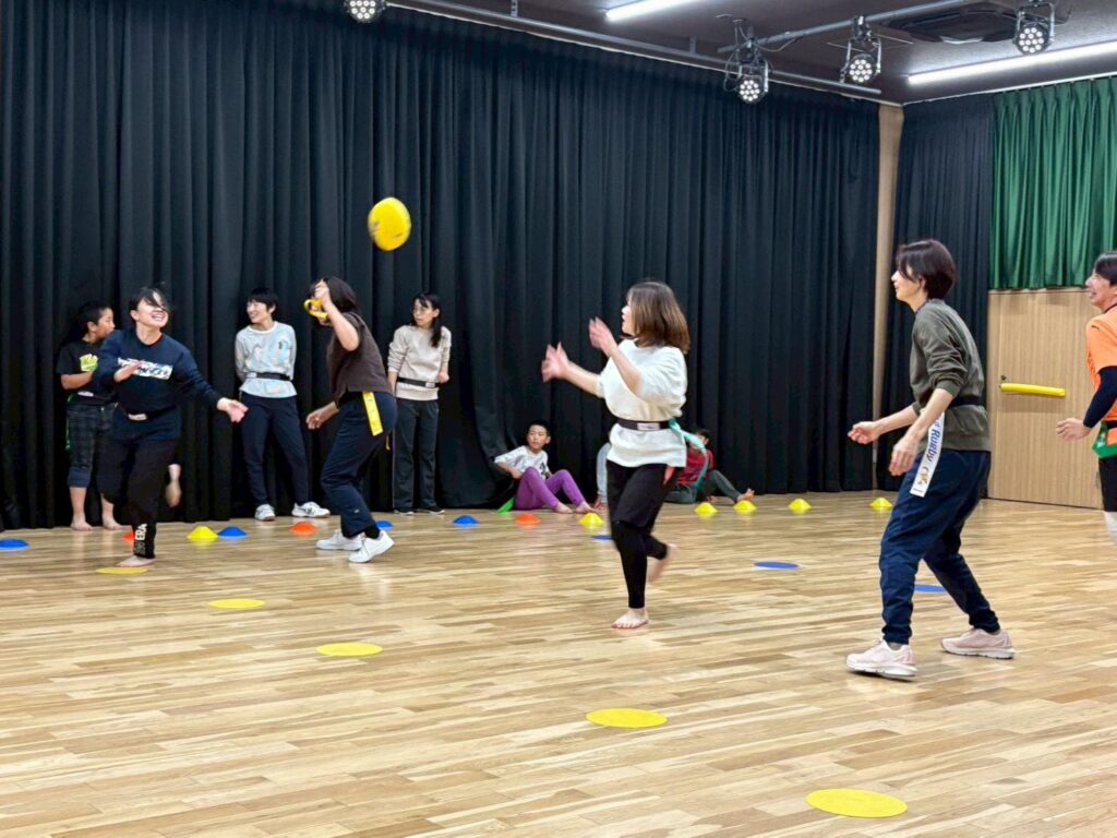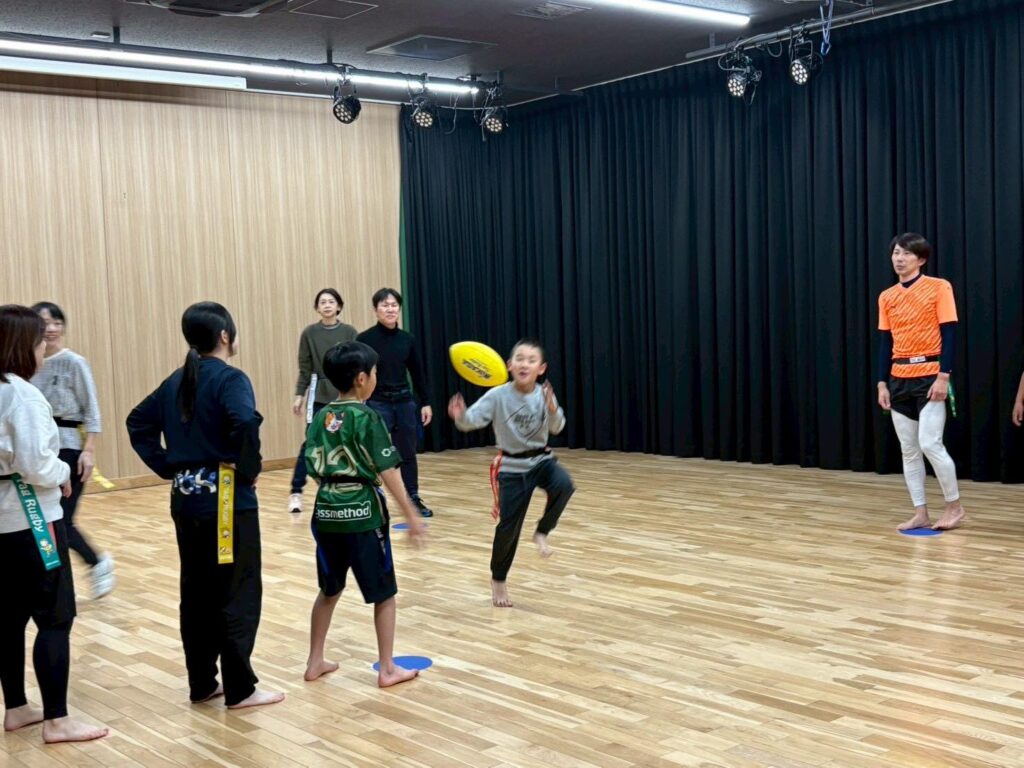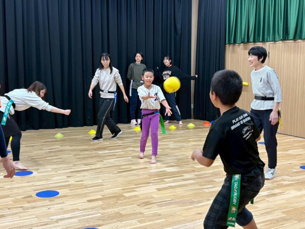 今回はボールに慣れながらタグラグビーの動きになれるメニューにしました。