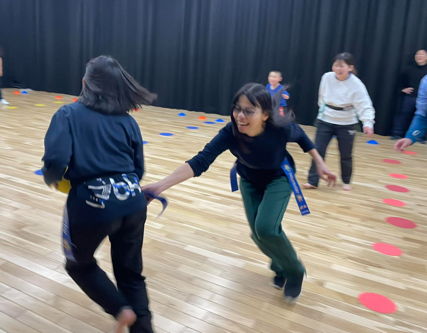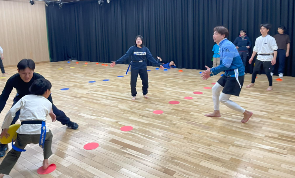 普通にやってもなかなか勝負がつかないので、3,3、7拍子の中で動いてもらうルールにしてみました。その次は3人のプレイヤーの中でこっそり一人オニを決めておいて動きを見た人たちにオニを当てさせるルールでやりました。
